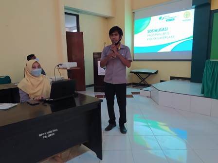 (BPJS) Ketenagakerjaan Kota Kendari, Mirza, bertandang ke kantor BPTP Sultra, kunjungan ini dilakukan untuk melaksanakan sosialisasi program Jaminan Sosial Ketenagakerjaan Kepada tenaga kontrak BPTP, sosialisasi ini dilaksanakan di Aula Kantor BPTP Sultra, Selasa, (7/9).