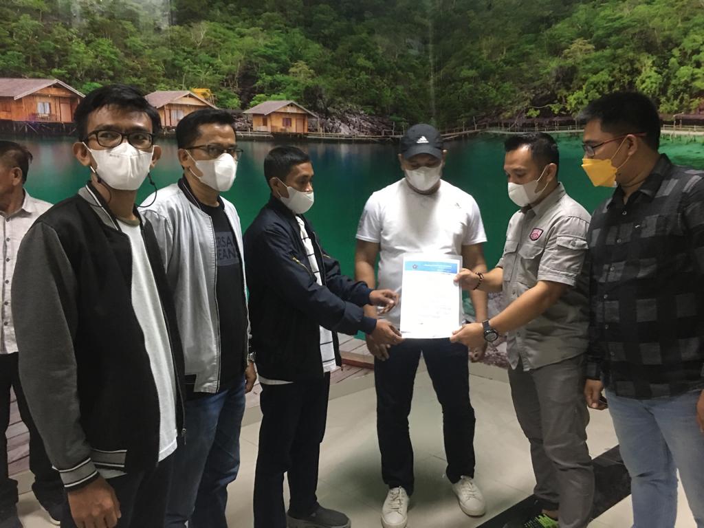 KETGAM, Ketua PWI Sultra Sarjono saat menyerahkan SK Kepengurusan kepada Ketua PWI Konawe Utara Jefri Ipnu. Dalam penyerahan SK ini, dihadiri oleh Sekretaris Umum PWI Sultra Mahdar Tayyong, Ketua SMSI Sultra Gugus Suryaman, serta Bupati Konawe Utara Ruksamin beserta jajarannya.