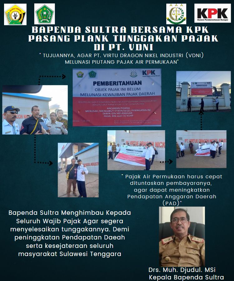 Sambungnya, karena belum membayar pajak, pihaknya dari Bapenda Sultra, Bapenda Kabupaten Konawe didampingi KPK dan Kejaksaan Tinggi melakukan pemasangan plank di PT. VDNI. Ini juga sebagai peringatkan kepada PT. VDNI, adanya pemasangan plank yang bertuliskan bahwa perusahaan ini belum membayar pajak daerah.