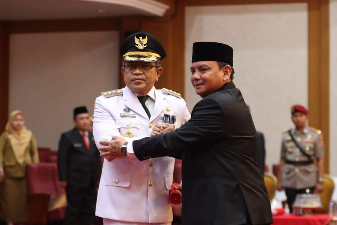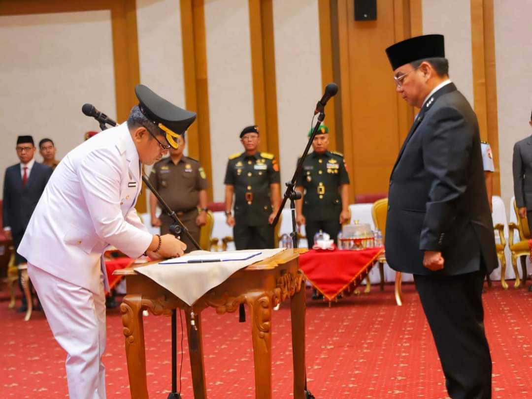 Setelah pengucapan janji jabatan, Pj. Gubernur menyerahkan surat keputusan dari Mendagri RI dan menyematkan tanda pangkat kepada Dr. M Ridwan Badallah.